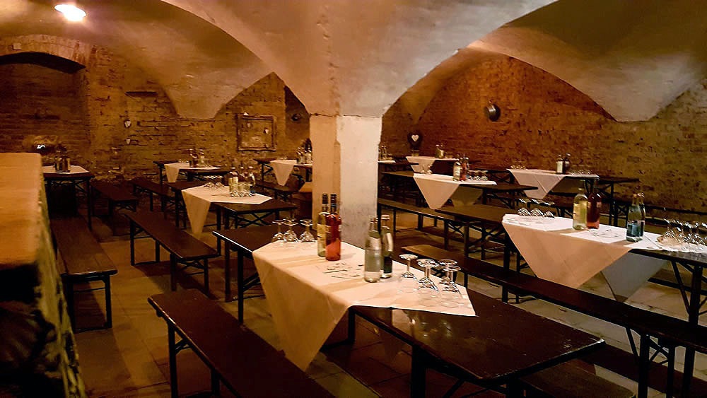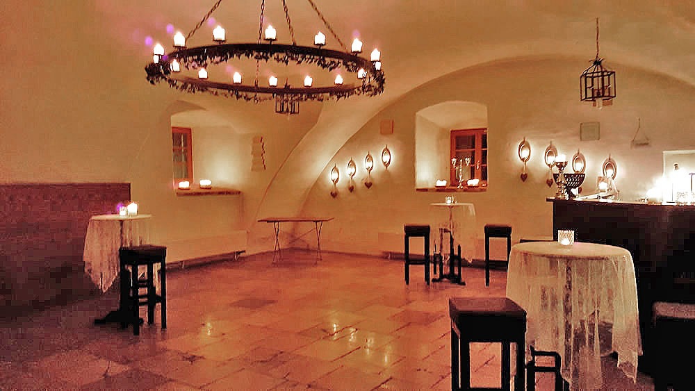 Für weitere 40 Personen kann in einem anliegenden Gewölbekeller eingedeckt werden, welcher aber auch als Bar mit großer Tanzfläche genutzt werden kann. Alle Räume werden von unzähligen Kerzen in ein warmes Licht getaucht.