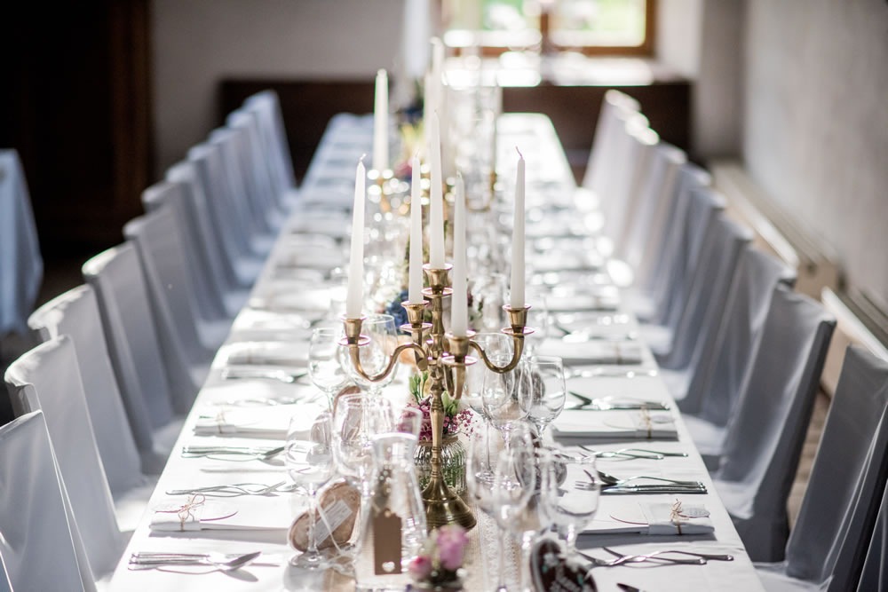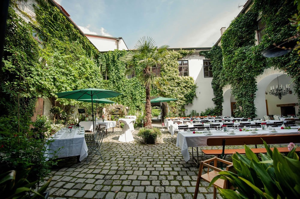 Sowohl der romantische Schloßinnenhof als auch unser Festsaal mit offenem Kamin bietet bis zu 120 Personen Platz.