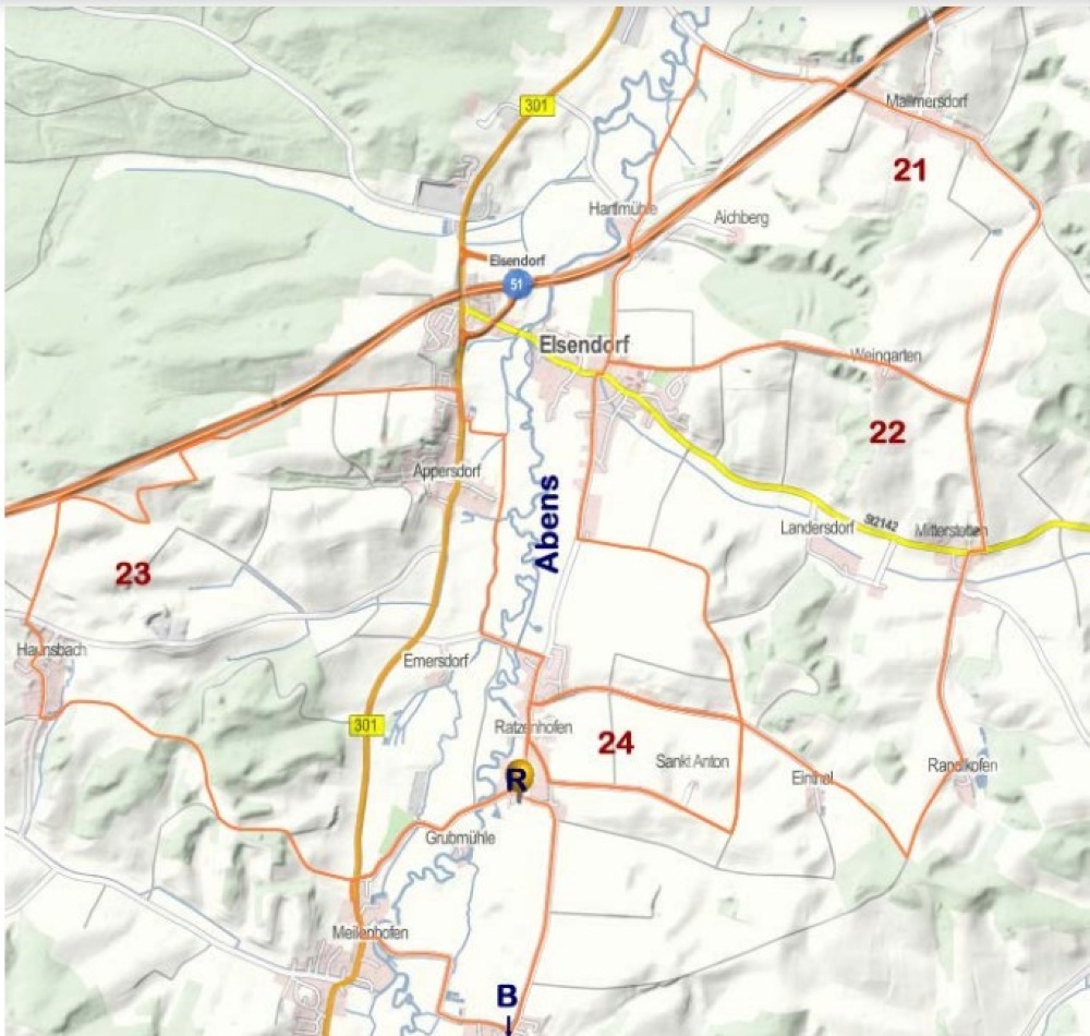 Wie Nr. 23, aber in Appersdorf auf den Glasergangsteig nach Elsendorf, dann über Hartlmühle, Mallmersdorf, Mitterstetten, Randlkofen, und Einthal nach Ratzenhofen.
